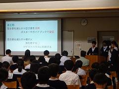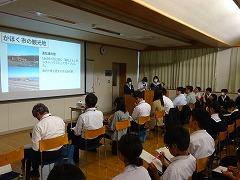 3、4限に、1年生がこれまで「かほく市」を題材に進めてきた探究学習の発表会が行われました。5月にかほく市役所の方をお迎えして「かほく市のまちづくり」について、お話しを聞かせていただいたことが、探究学習のスタートでした。5月のお話しから、①スポーツ、②定住促進・子育て、③観光、④特産品、⑤空き家、⑥防災の6つのテーマを設定し、調べたこと、考えたことを発表し、市役所の方々に聞いていただきました。中学生にとっては、それぞれ調べていたことがつながり、発表会全体を通して「かほく市」について考える機会となりました。