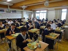 10月31日、今日は「ハロウィン」です。この欄でも紹介しましたが.。グレース先生が、ハロウィンを紹介する掲示で、ハロウィンについても理解が深まったようです。さらに、今日は「ハロウィン給食」でした。写真は3年生の給食中のようすです。ちなみにメニューは「チキンライス」「かぼちゃひき肉フライ」ハロウィンスープ「パンプキンババロア」と見るだけで楽しくなります。チキンライスの中には、星や人形をかたどったハッピーアイテムが入っていました。