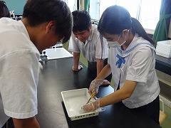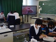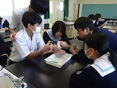 「動物は、どのような仕組みで運動をするのか」という課題で、手羽先の解剖をしていました。手羽先の皮をはぎ、筋肉を見える状態にしました。骨の両側に筋肉があることを確認し、色々な場所の筋肉を引っ張ると対応する骨が動きます。筋肉はけんとつながっていることなど目に見える構造や、手羽先を構成するものの硬さの観察を通して運動の様子を理解しました。手羽先の観察でしたが、人間の体に置き換えて理解することはできたでしょうか。
