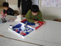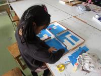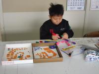 2年生が図工の時間に、空き箱を使って、迷路のような作品を作っていました。
