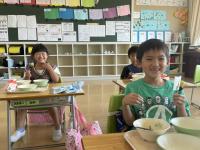 給食時間に子供たちに食べてもらいました♪ 味はどうだったのかなあ。(笑)