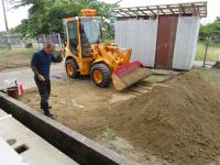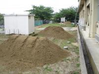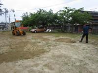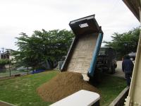 地震でできた傾斜や亀裂を追加した山砂で埋めて、踏み均しています。