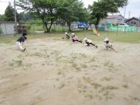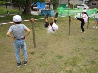 曇り空ですが、1年生が体育の時間に外へ出て鉄棒遊びをしていました♪
