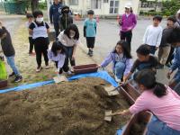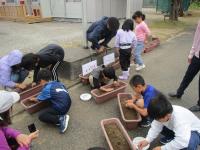 校務員さんに、プランターに入れる土の量や、種の巻き方などを教えていただき、