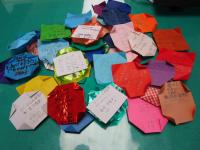 きれいに折られた折り紙に、私たちを励ますメッセージが書かれています♪