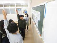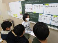 4年生が算数の時間に、ホワイトボードに書いた自分の考えを説明しています。