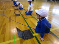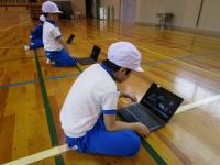 1年生が、体育の時間にタブレット端末で、自分で自分の姿を撮影したり、