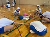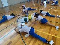 今日は全校児童で、5,6年生の指導を受けて「たこストレッチ」の体験会を行いました。