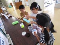 学校の図書館の本を参考に、夏休み中に作ったスライムで子供たちが遊んでくれています♪