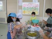 1年生が生活科の学習で,学校の中庭に実った梅の実でジュース作りに挑戦しました。取った梅の実のじくをようじで取り除き,煮沸消毒した瓶にグラニュー糖と一緒に詰めました。出来上がりを楽しみにしています。