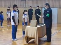 珠洲警察署長様,生活安全課の皆様,紅谷蛸島地区防犯委員長が来校され,入賞した5名の児童に賞状を渡していただきました。
