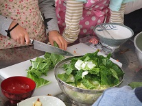 3つの縦割り班毎に豚汁づくりを始め、4限目は体育館で、なかよしゲーム(宝さがし・ドッジビー)を行いました。