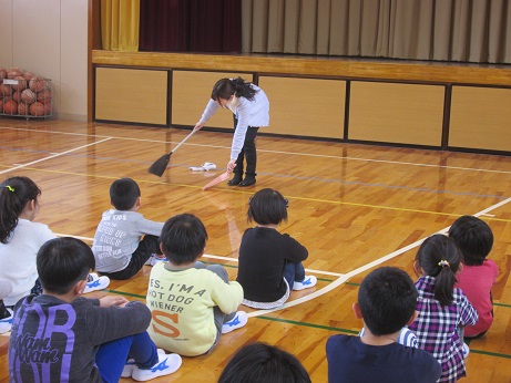 新しい縦割り班のメンバーを確認し、日々の班活動である掃除について用具の使い方や手順を確認しました。