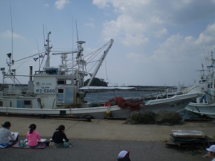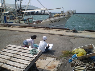 蛸島小学校の春の写生大会は、蛸島漁港に泊めてある船の絵を描きます。