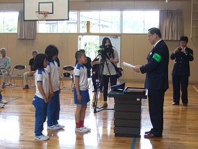今日は警察署から署長さんも来られて、防犯標語の表彰式と防犯イモなえうえを行いました。イモなえうえには、蛸島町の青年福祉員の方々をはじめ、多くの地域の方々のお力をかり、無事植えることができました。
