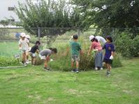 1,2年生が、生活科の時間にスイカやミニトマトなどを育てた学級園の片付けをしています♪