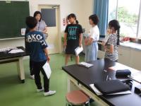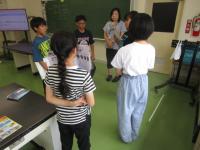 立ったまま円形になり、自分の考えを、理科用語を使いながら伝えようとしています。