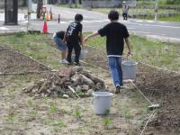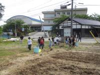 蛸島小の子供たちと先生方は、ジョロやバケツを手にして、水やりです。