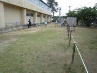 校長室の窓から、学級園の方を見ると、先日、1,2年生に野菜苗の植え方を