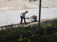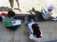 校務員さんが、学校周りの側溝にたまっている土や落ち葉を、