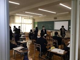 玄関前で健康チェックを受けた後、教室に向かい、教室では、いつも以上に距離をとって着席しました。休業中の生活等についての確認やメール配信の登録、Googleclassroomなどの確認や課題の回収等の後、部屋を移動し、希望する進路に応じて、説明や連絡、確認が行われました。