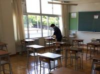 生徒が学校を出た後は、感染予防のため先生方が机などの消毒を行いました。登校日も今日で最後、来週からは授業を再開する予定です。月曜日また元気に登校してきて欲しいと思います。