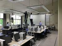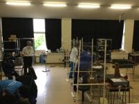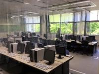 登校日の傍ら、学校再開に向けていろいろな準備を進めています。コンピュータ室では、生徒の距離の確保が難しいために、先生方が協力してビニールシートを使った感染予防のためのカーテンを作成していました。多くの先生方の協力で、右の写真のようにできあがりました。