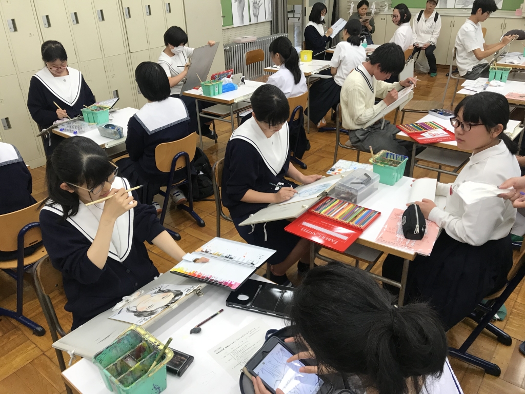 イラスト、デッサン体験、アトリエ見学、似顔絵(辰巳生が中学生の似顔絵を描く)