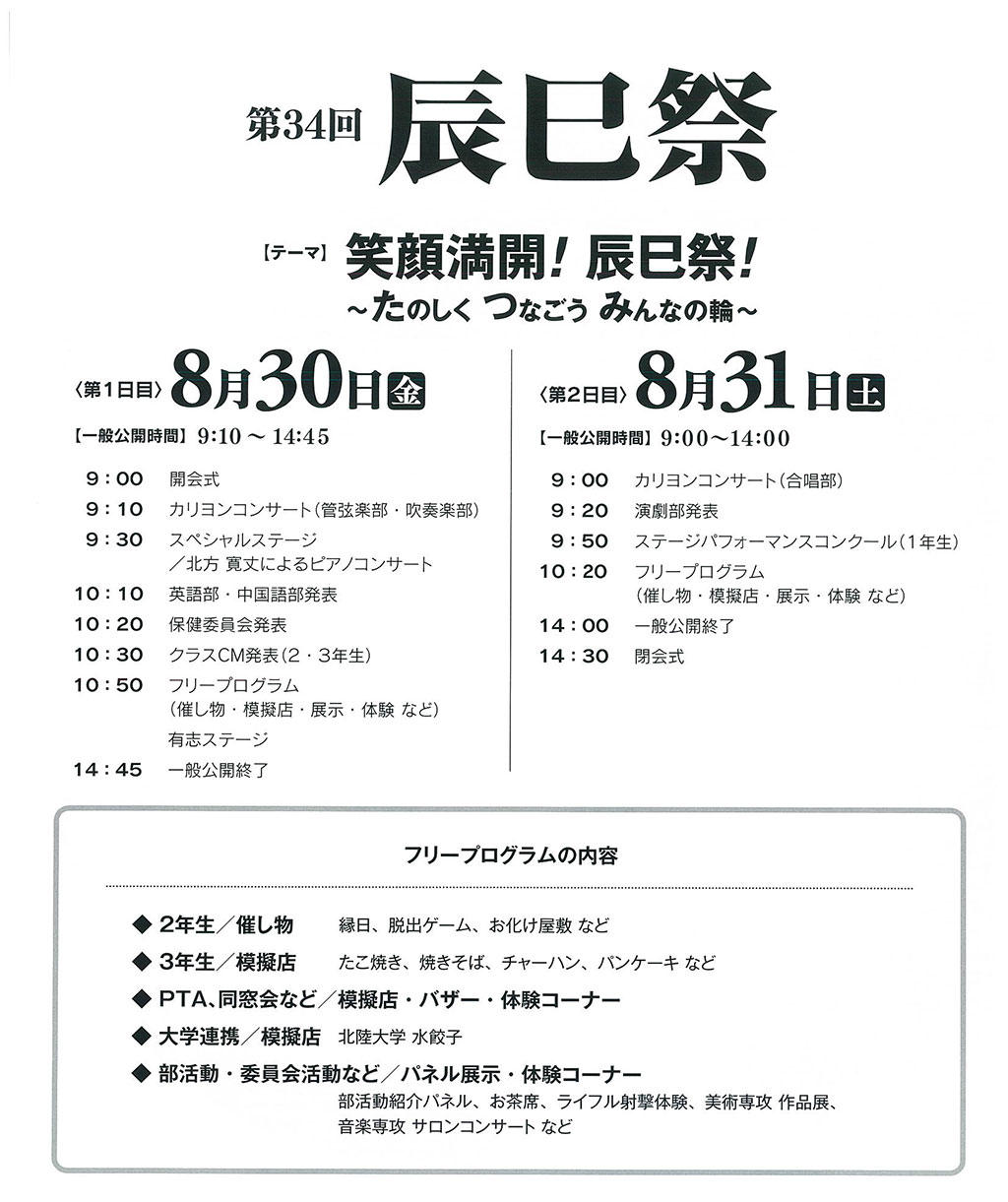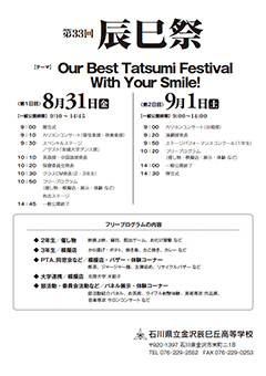 ぜひ、お気軽に学校を見ていただき、金沢辰巳丘高校の教育活動をご理解いただきたいと思います。生徒または保護者の方のみのご参加も歓迎いたします。