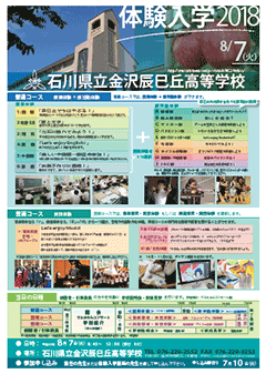 平成30年度 石川県立金沢辰巳丘高等学校 体験入学を8月7日(火)に開催いたします。