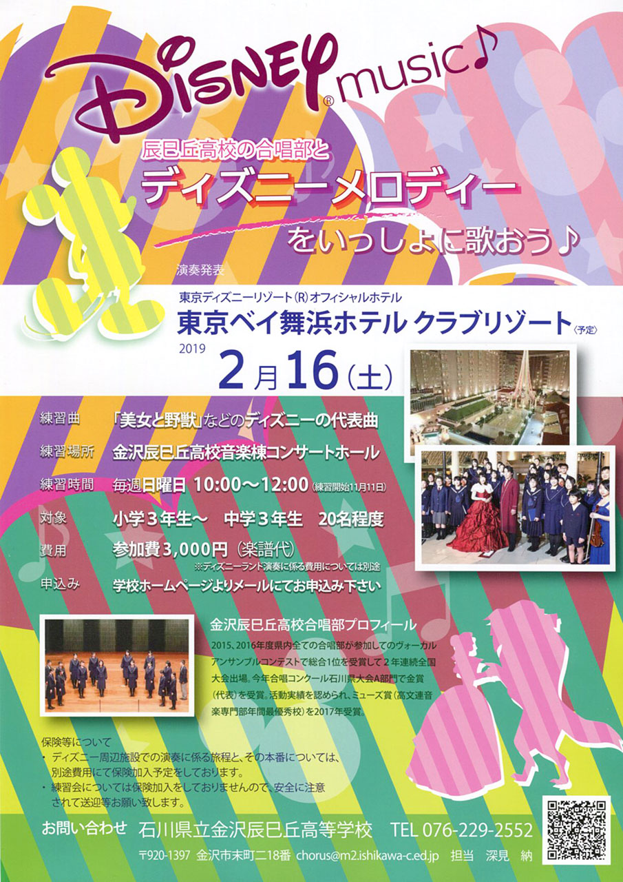 金沢辰巳丘高校合唱部20名と金沢市内や福井県からの小中学生12名のメンバーと共に練習しています。現在、小中学生のメンバーを募集中です。一緒にディズニーランドオフィシャルホテルで演奏しませんか!!