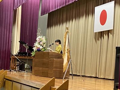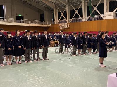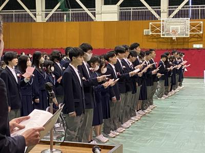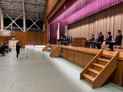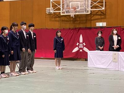 式の前に次年度前期生徒会役員の認証式を実施し、次年度の生徒会活動の運営が託されました。認証式後の表彰伝達式では3学期の活動においての表彰等を披露し、この1年間の皆勤者の表彰も行いました。