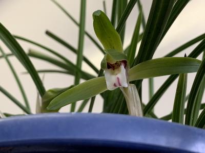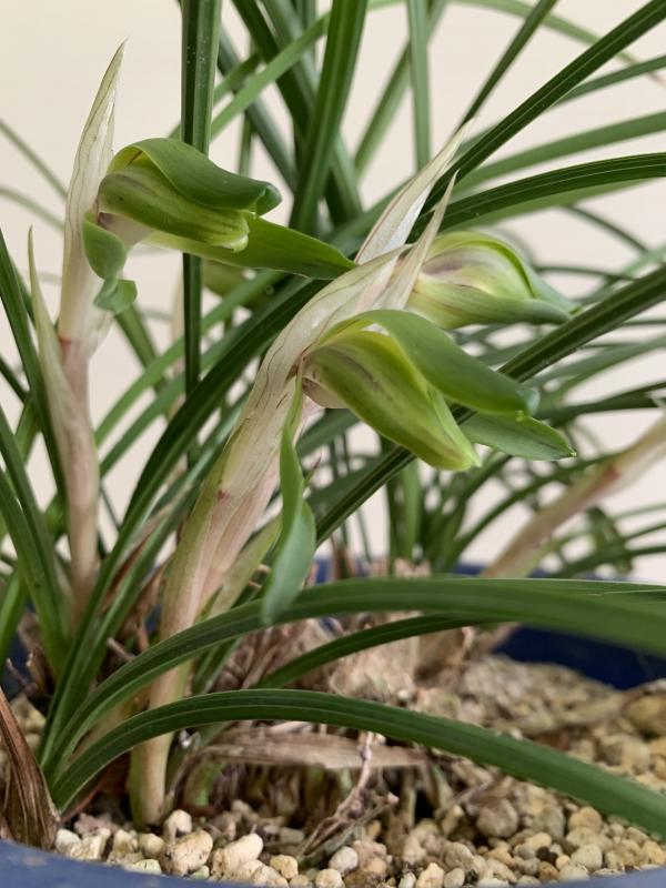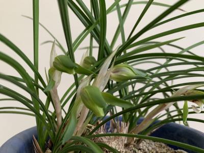シュッとした硬い葉に守られるように、そして緑色でひっそりとうつむいて咲いているので見つけにくいのかもしれません。