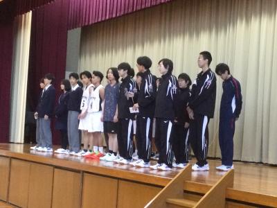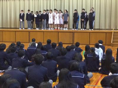 11月11日(火)7限後、後期新人大会に参加する部活動(ライフル射撃部・バドミントン部・男子バスケットボール部・合唱部・写真部・トランポリン)の激励会を行いました。田口教頭先生・生徒会長の激励の言葉に続き、生徒みんなで三三七拍子をして応援の気持ちを選手たちに伝えました。