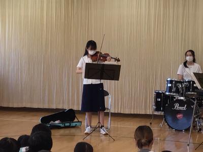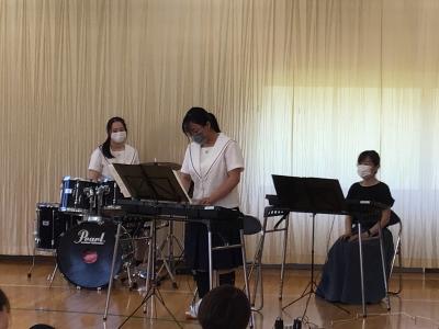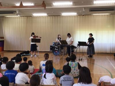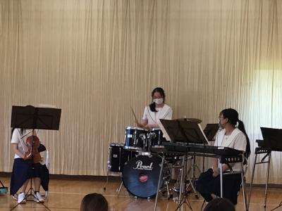 8月3日(木)に、本校近隣の「末こども園」を訪問し、演奏させていただきました。今回はバイオリン・キーボード・ドラムセットの3名での訪問でしたが、お子さんたちの素直に喜んでいる表情に高校生も癒される時間となりました。今後機会があればぜひ演奏をさせていただきたいと思います。