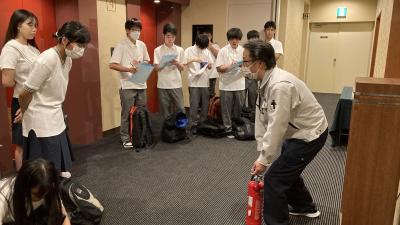 地震発生直後の安全行動をとるとともに、その後火災が発生したとの想定のもとで訓練を実施しました。