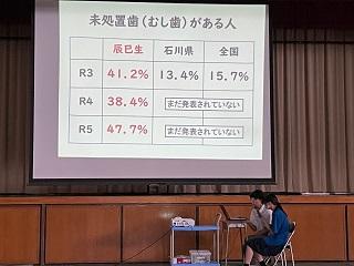 今年度本校では、歯科検診でむし歯の疑いのある生徒が47.7%いました。石川県や全国の高校生と比較すると、辰巳生はむし歯のある人がとても多いということになります。