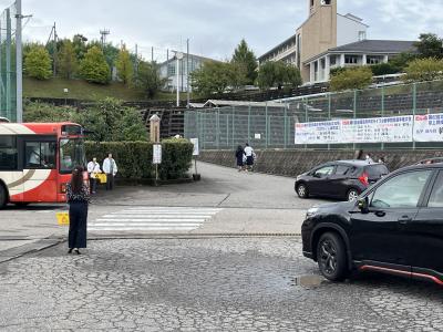 校門バス停前は、時間帯により路線バス、送迎車両、降車後道路を横断する生徒、自転車の生徒で混み合います。ゆずり合い、マナーの遵守により事故が起こらないよう気をつけてほしいと常々感じます。