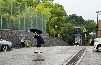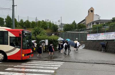昨日までの晴天からうって変わり、梅雨の時期らしい天候の中での実施となりました。雨のため通常に比べ送迎の自家用車も多く、8時10分前後の時間帯ではバスの発着とも重なり混雑する状況が生じます。雨のため見通しが歩行者生徒、運転者共に悪くなるので、周囲の状況を注意深く確認しながら、安全な登下校を確保できるようにしていただきたいと思います。