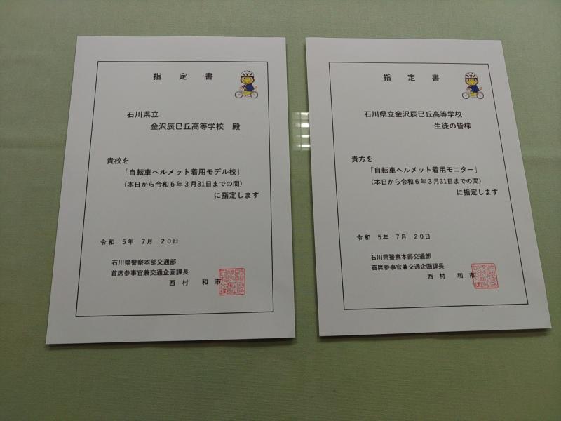 7月20日、石川県警より「ヘルメット着用モデル校指定書」をいただき、自転車用ヘルメット10個を託されました。生徒代表の中口さんが立派に決意の言葉を述べてくれました。