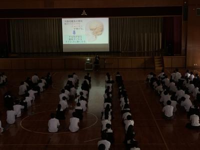 終業式で学校長は、あまり聞き覚えのない「スピンドルニューロン」という脳内の神経細胞について話されました。この細胞は一旦のびると縮まらず、人生を楽しく有意義に過ごしてきた人ほど長くなっているそうです。また、これがのびていることにより考え方が前向きになり、ストレスにも強くなれるようです。ではどうしたらのばすことができるのでしょうか?・・・みんななるほどと思える内容のお話で、とても心に残りました。