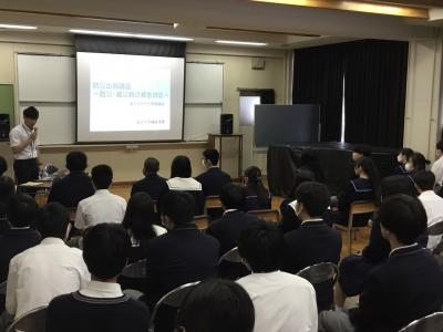 5月23日(火)、1年生の総合的な探究の時間の「防災減災学習」で、金沢市危機管理課及び金沢市消防局 中央消防署小立野出張所の消防士の方々から防災減災について映像や写真をもとに詳細に教えていただくことができました。