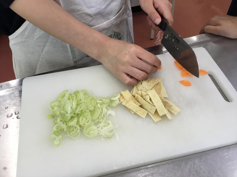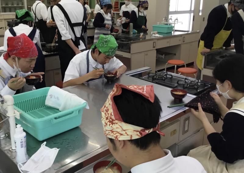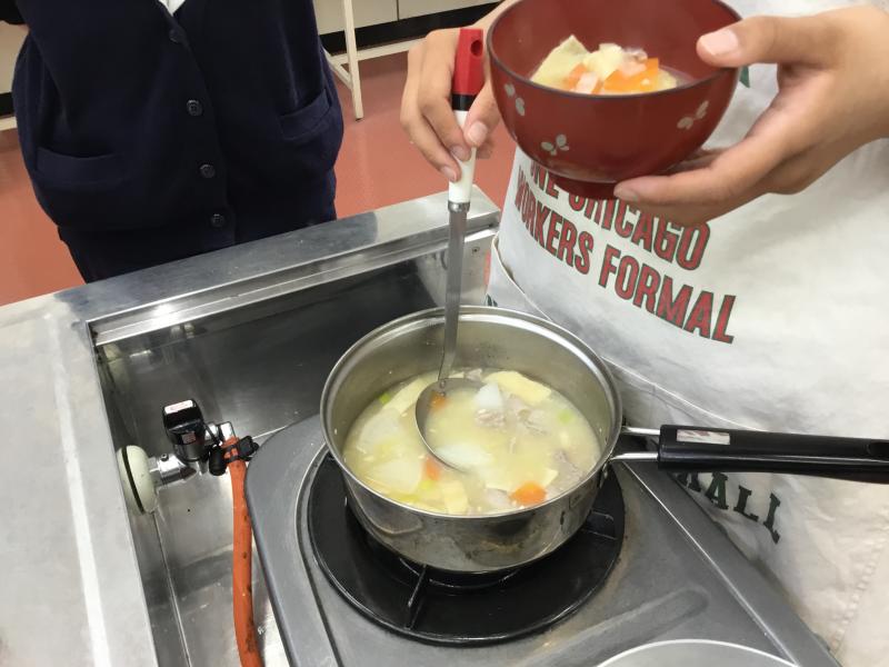 コロナ禍で、中学校ではほとんど実習ができなかったそうですが、4月からの実験や実習経験を活かして、素早く豚汁を作ることができて、とてもおいしく出来上がりました。