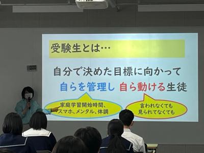 校長先生から激励の言葉をいただき、進路課の先生からはこれからのスケジュールや受験生としての心得など、身が引き締まる内容の説明をしていただきました。