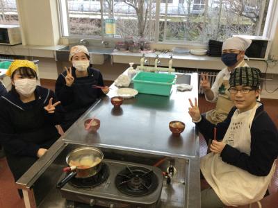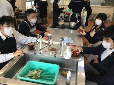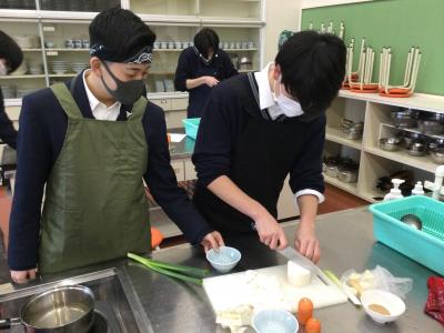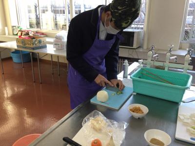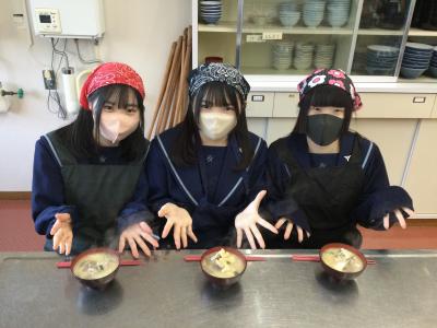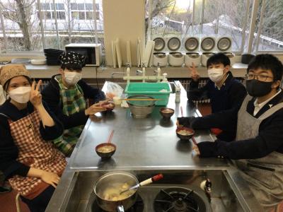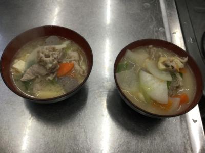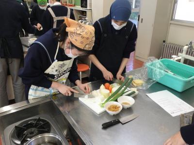 色とりどりの頭巾とエプロンを身につけて調理室に集合した普通コースの生徒たち。中には、大根やニンジンを上手に素早く切る生徒も、初めて包丁を持つような手つきの生徒も見られたのですが、班ごとに協力しあった結果、1時間ほどでおいしそうな豚汁がしっかりできあがりました。