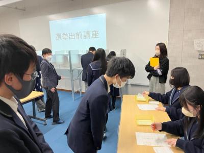 1月19日(木)、石川県選挙管理委員会、金沢市選挙管理委員会、北陸財務局の方々のご支援を受け、選挙出前講座として「模擬選挙」を体験しました。