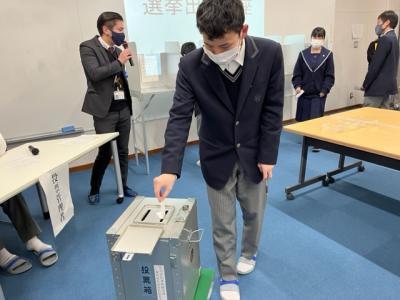 その後、生徒代表によるデモンストレーションを見て手順を確認し、ひとりひとりが本物の投票用紙を本物の投票箱に投票していきました。