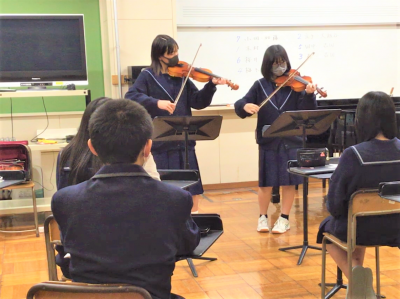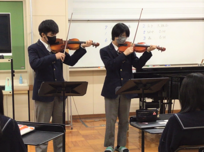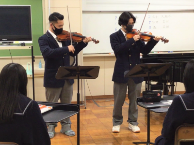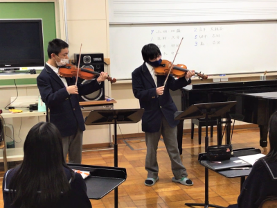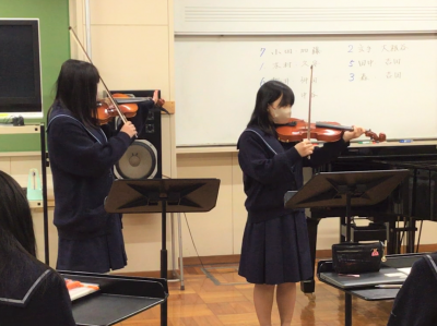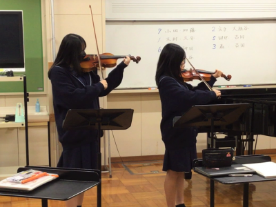 1月24日(火)、普通コースのヴァイオリン講座の発表会にて、「きらきら星」を二重奏で演奏しました。