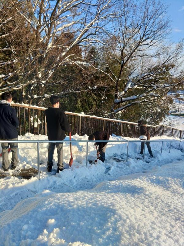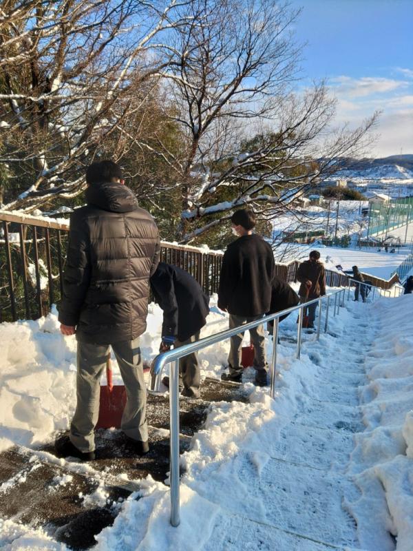 雪が積もった朝、本校ではクラスごとに当番となって階段を除雪します。少人数で行うととんでもなく時間と労力がかかる作業ですが、みんなで一斉にとりかかると短時間でとても広いスペースが除雪できます。