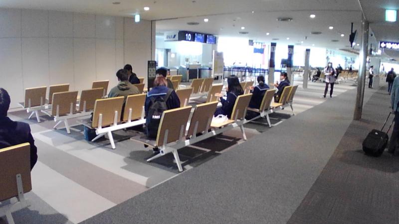 搭乗ロビーでクラスごとに指示を受け、昼食をとっています。